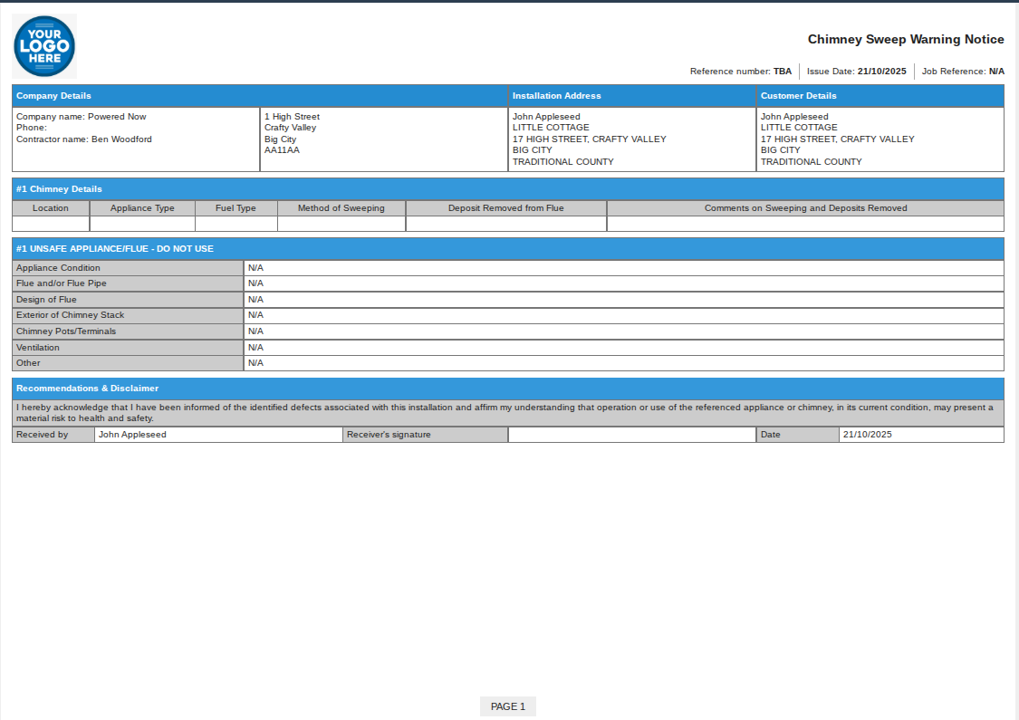 Create Chimney Sweep Warning Notices digitally using Powered Now