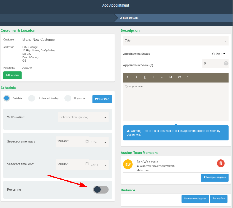 When creating an Appointment within Powered Now it gives you the Option to create a recurring Appointment, This is a mass creation of appointments which can be useful for recurring meetings/jobs/things to do on a daily/weekly/monthly/yearly schedule.