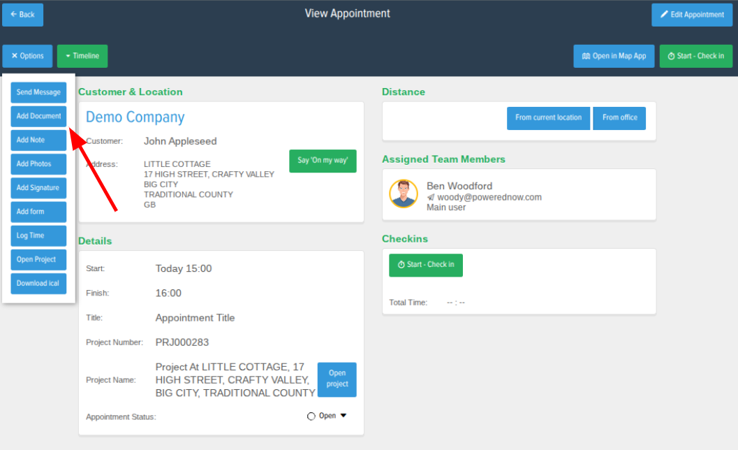 To do this click onto the appointment you'd like to create the document from then select Options and then Add Document.