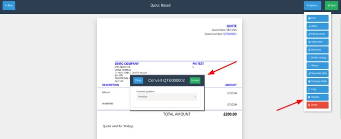 Once that is done, to create a part invoice select the quote you'd like to create this for and then select Options > Convert, then have Invoice selected on the drop down and select Convert.