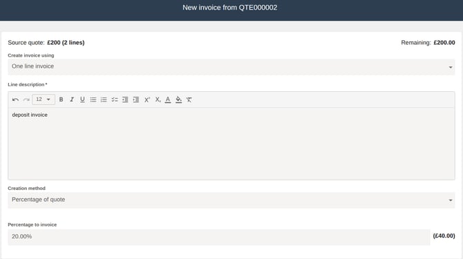 One line invoice - This lets you enter your own description for a single invoice line and then create an invoice for either a percentage of the quote total or a fixed amount.