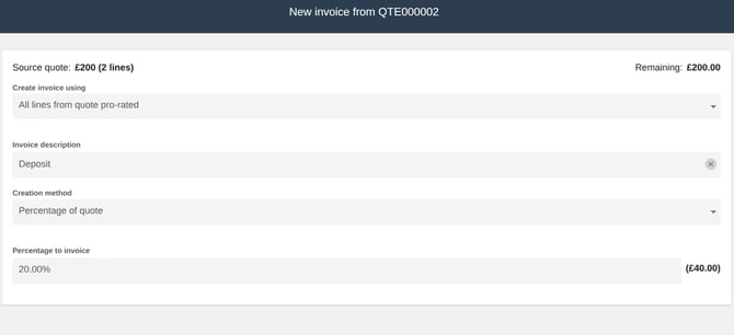 All lines from quote pro-rated - This will convert all of the individual lines from the quote into an invoice and let you invoice either a percentage or a fixed amount of the quote total. You can also add a custom title to this invoice if you like (e.g. “Deposit”).