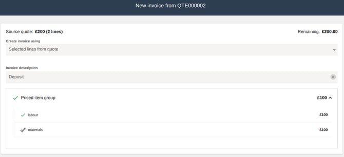 Selected lines from quote - This option lets you choose specific pricing lines from the quote to include on the invoice. For example, you can create a deposit invoice so the customer pays for the materials listed on the quote. You can also add a custom title to the invoice if you wish (e.g. “Deposit Invoice for Materials”).