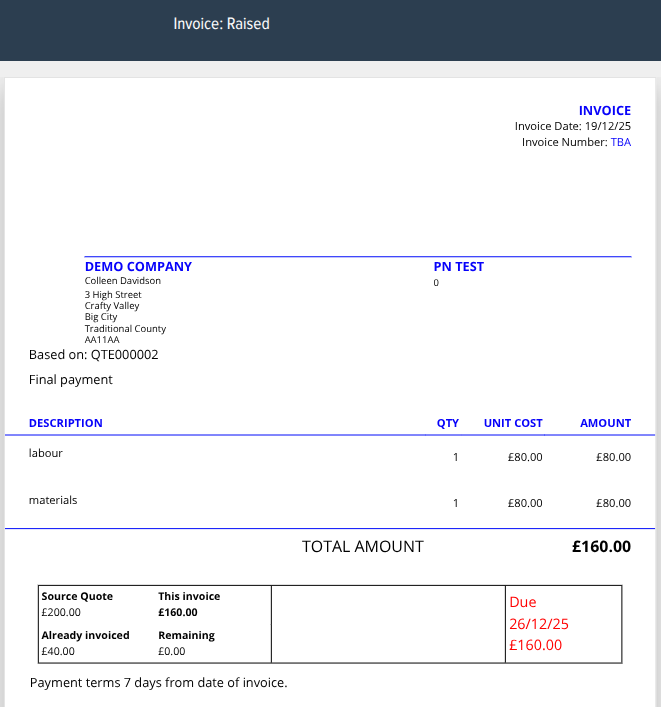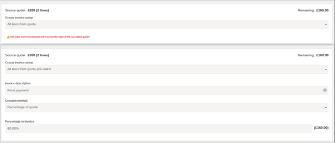When you’re ready to raise the next or final invoice from that quote, open the quote again, select Options > Convert, and convert it to an invoice as before. When you reach the screen where you choose how to create the invoice from the quote, the system will recognise that an invoice has already been created for this quote.