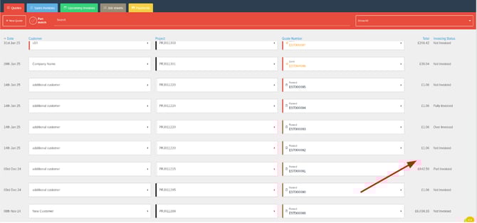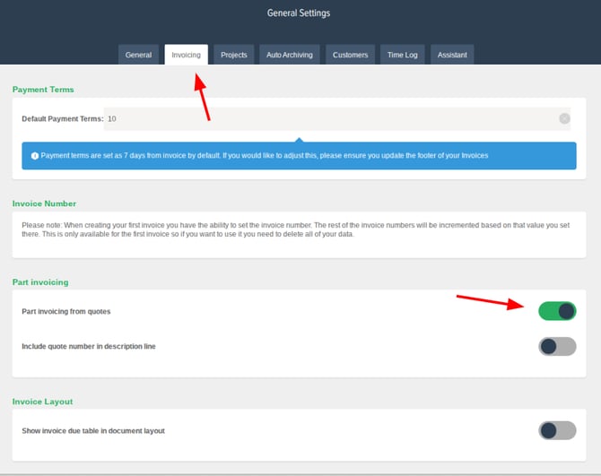 First you will need to make sure that you have part invoicing enabled in the settings. For this click on the Settings Cog (top left of the home page), then from there click into General Settings and then select the tab for Invoicing at the top. In there will be a switch to enable Part invoicing for quotes.
