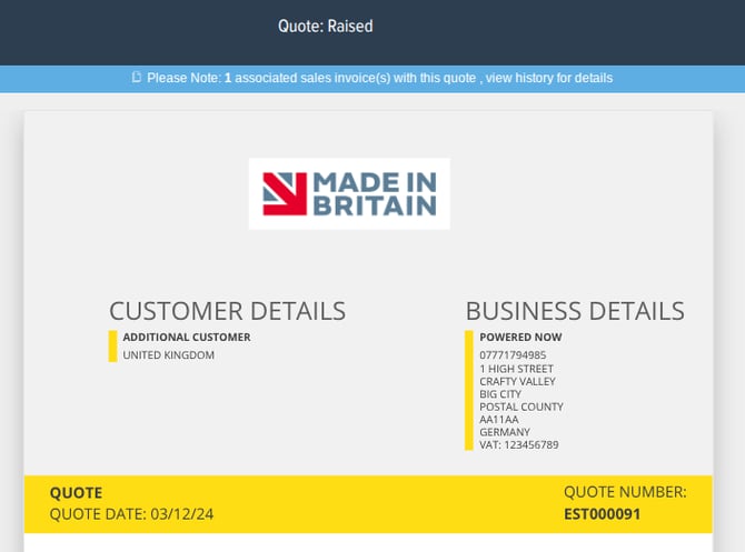 Once any part invoices are created, the quote that they were created from will display a banner at the top of the screen stating how many invoices have been created from that quote. Then in the history of the quote will be a breakdown of the invoices that have been created from it.